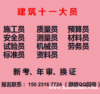 1、考试岗位有:质量员、预算员、施工员、安全员、材料员、测量员、机械员、劳务员、试验员、标准员、资料员。3、报考须知:(1)要求年龄男18-65周岁,女18-60周岁,每期每人限报一个岗位(两地报名无效),成绩一年内有效。(2)资料员证书为城建档案馆统一组织,因名额有限,我校培训学员优先报考。其他几大员证书由建委颁发。4、报名材料:(1)一寸红底或蓝底免冠照;(2)身.份.证.复印件;(3)建筑相关学历或工作证明。